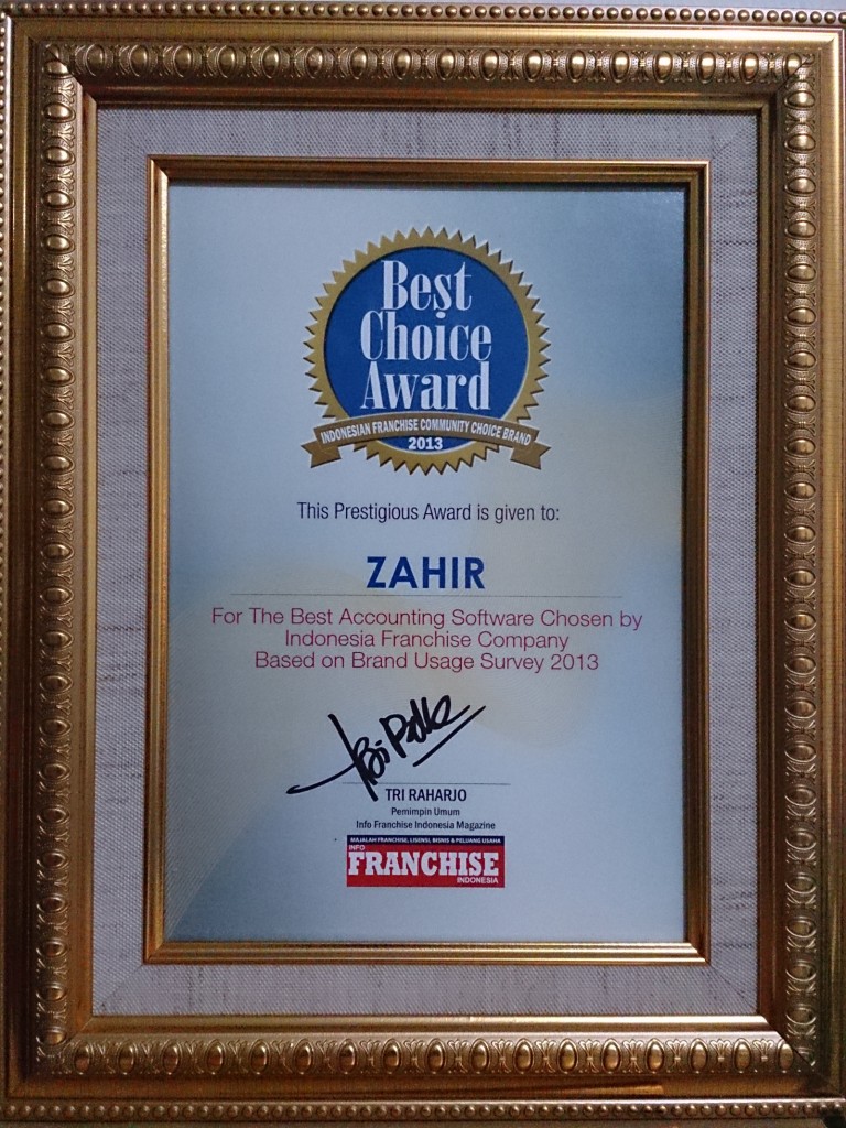 PT Zahir Internasional pemegang merek Zahir Accounting berhasil mendapatakan penghargaan Best Choice Award 2013 untuk kategori Software Akuntansi.